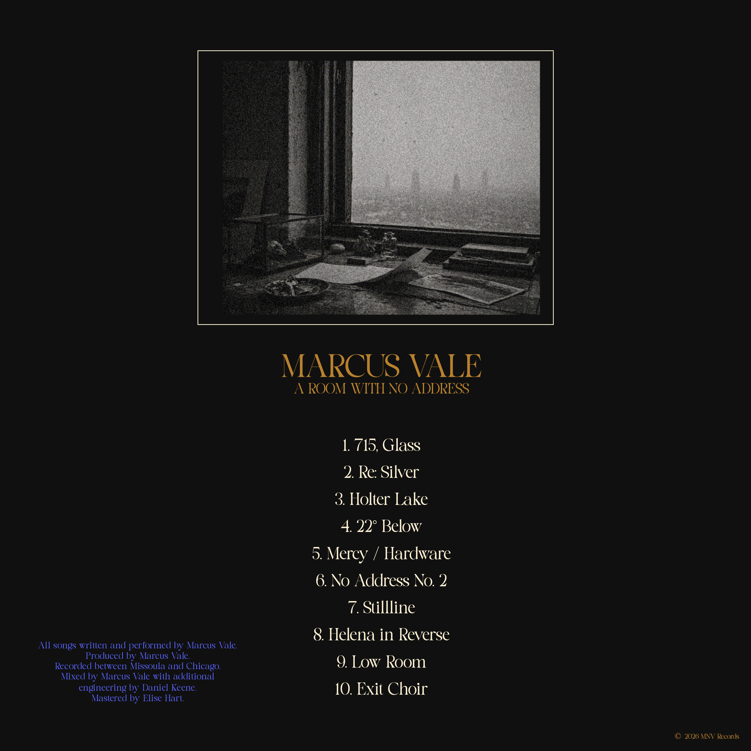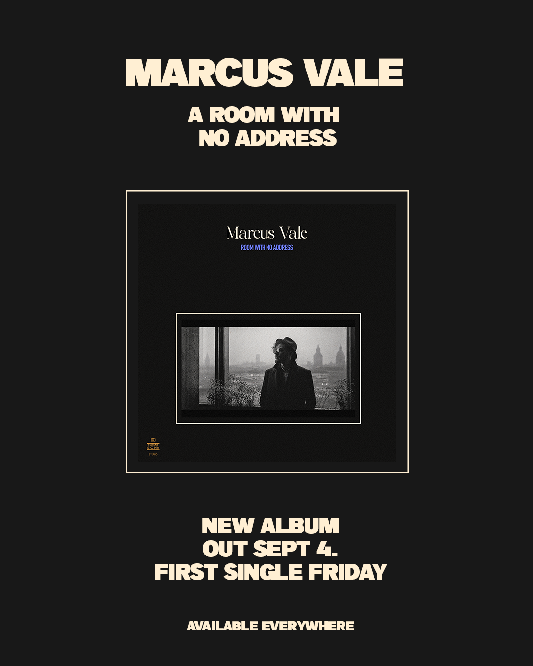 Marcus Vale is a 33-year-old solo artist from Missoula, Montana making polished alternative rock with art-rock restraint, post-punk rhythm, clean guitar hooks, and a dry baritone vocal style. After years working as a touring guitarist and behind-the-scenes producer, A Room With No Address presents him as a fully formed frontman: controlled, adult, visually literate, and serious without feeling theatrical. The project is built around taste, restraint, and quiet ambition rather than local-scene grit or rock cliché.