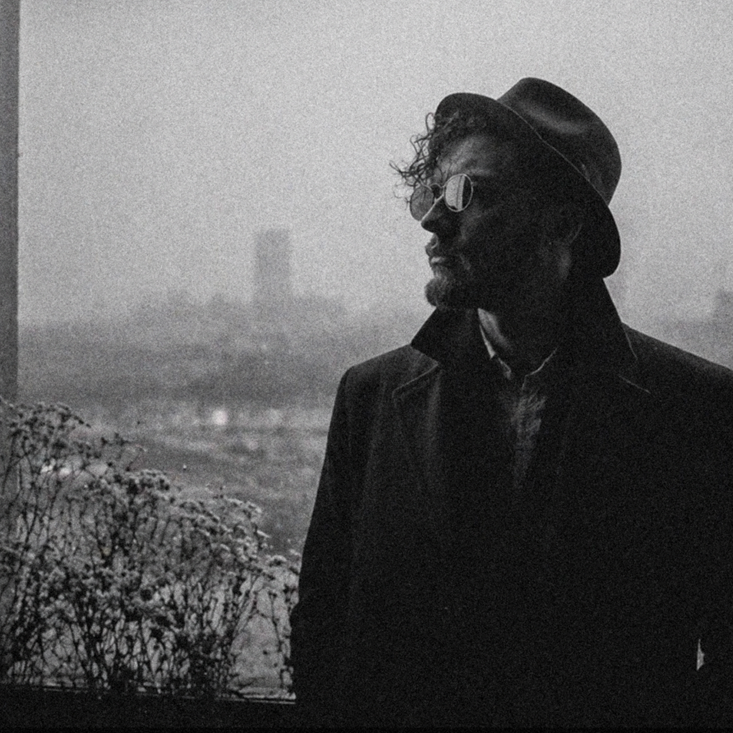 The cover uses a restrained, gallery-like layout: a wide black-and-white portrait sits low on a deep black field, framed by a thin cream border with generous negative space above. The image feels cinematic and controlled, with Marcus placed inside a windowed architectural scene rather than posed like a traditional rock artist. The fog, glass, and distant skyline give the record a sense of distance and pressure without relying on obvious Montana imagery or genre clichés.